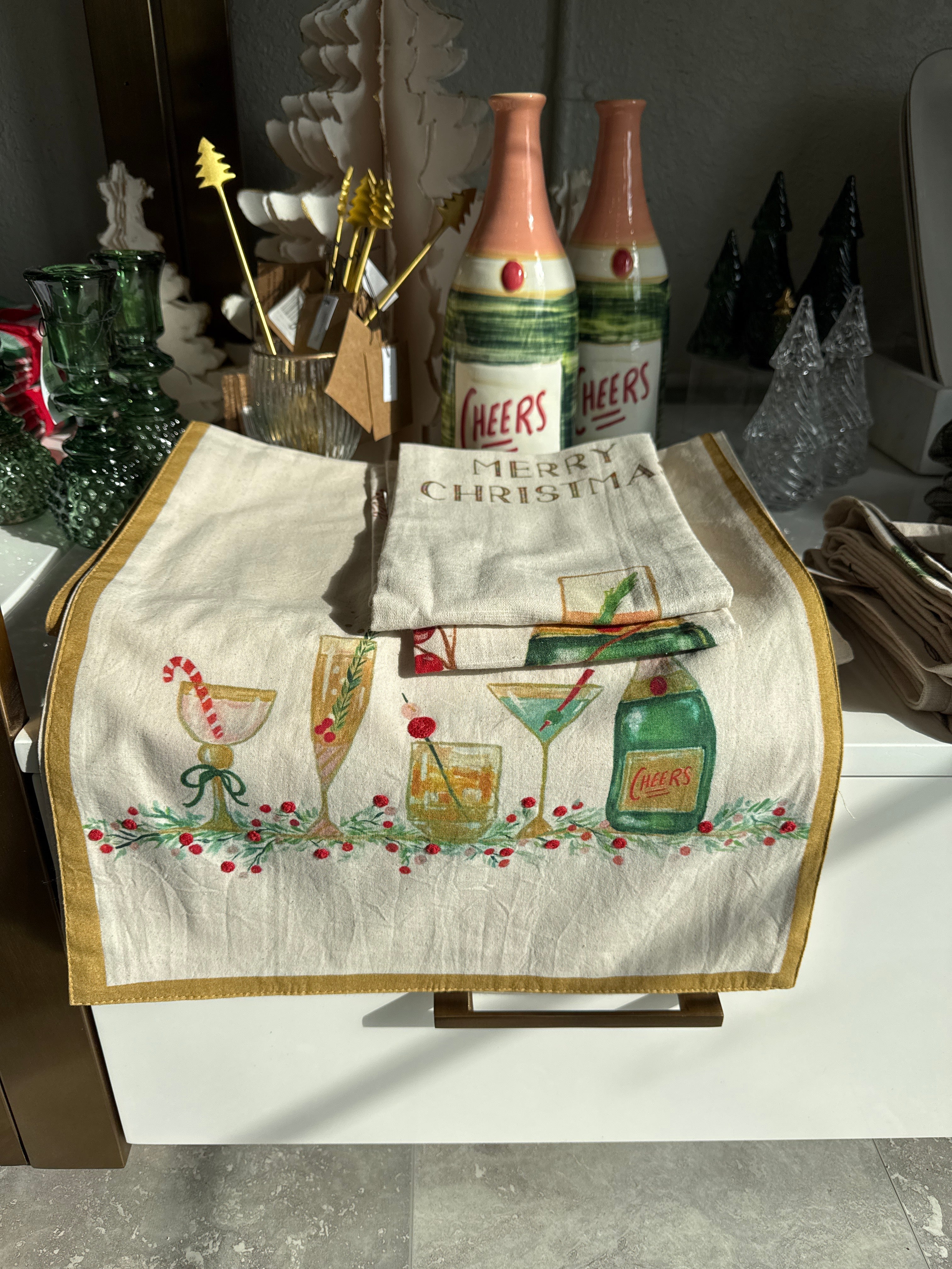 Cotton Printed Table Runner w/ Holiday Cocktails & Gold Trim