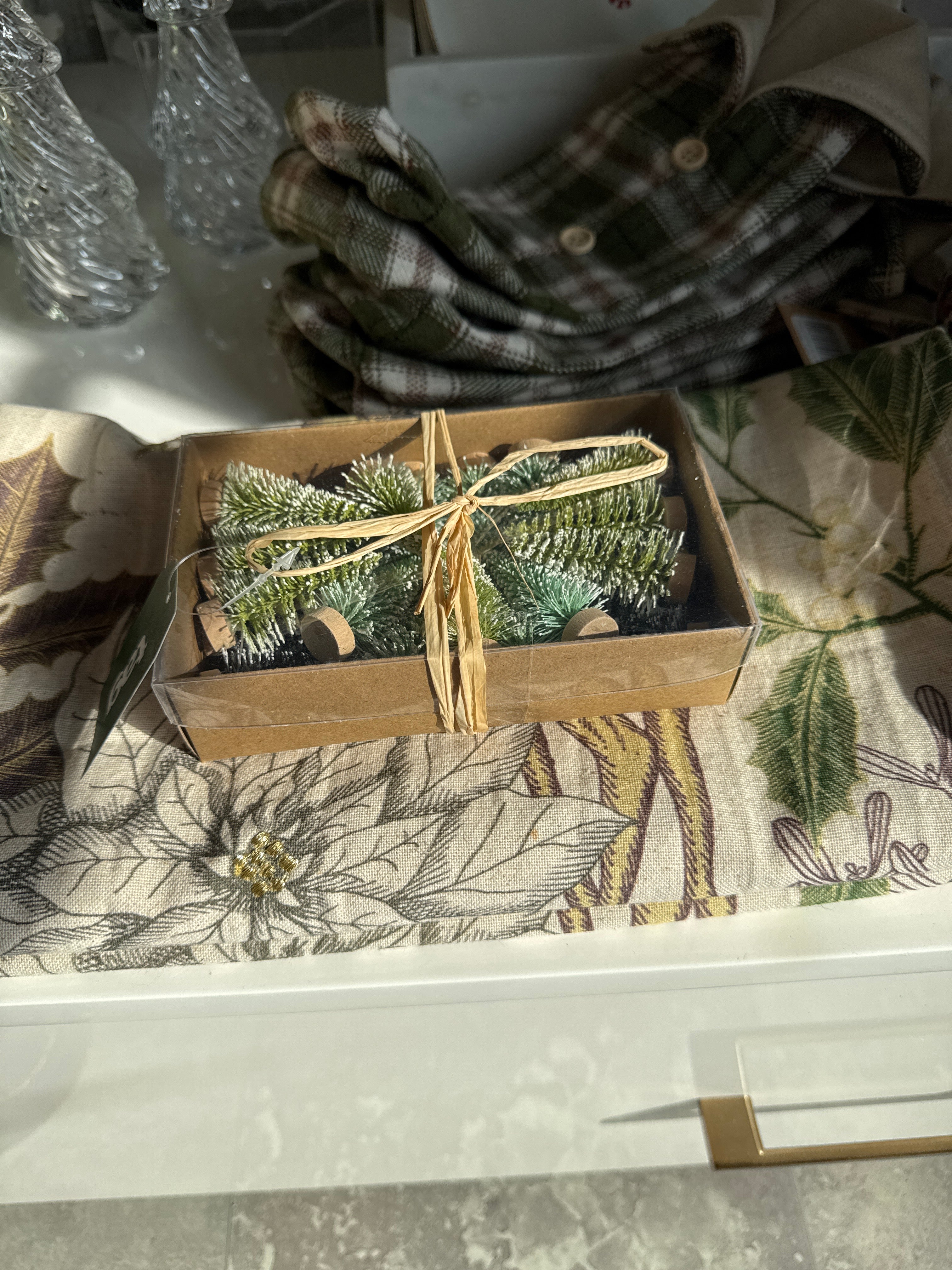 Set the scene. Mini brush trees are all the rage and the perfect accents to any display for instant holiday charm. Featuring a snow effect finish, each tree stands on a wooden base. Coordinate with various sizes of brush trees from tag to achieve dramatic variation for tables, consoles or mantels.