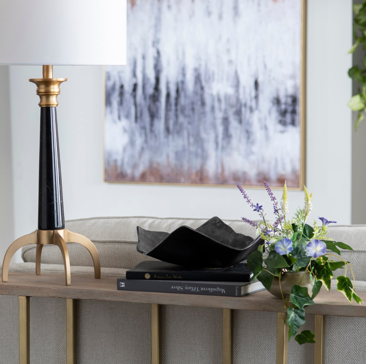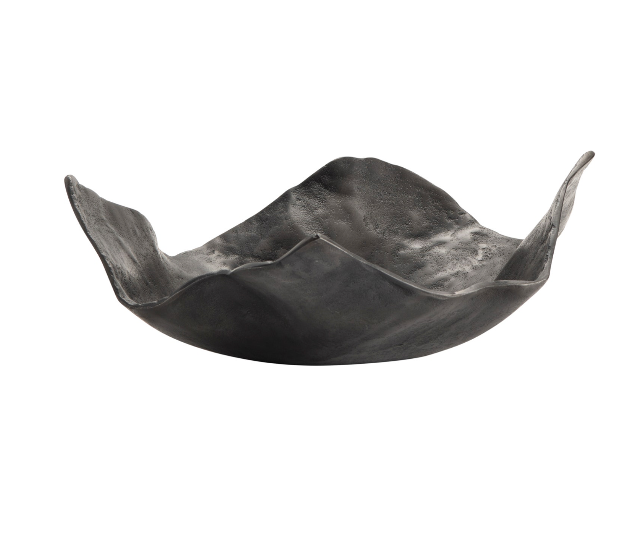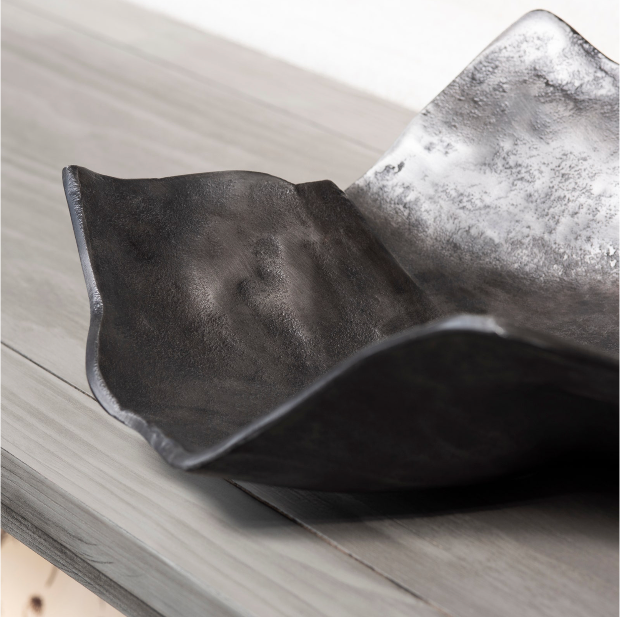 The Crestview Collection Vaughn Medium Charger Tray is made of aluminum with a black and gray finish. This conceptual piece of art has no two sides exactly the same. The waves along the edges guide you around the piece. The depth of the tray varies and there is no large flat space, making this tray best suited as a display piece on a shelf or console.