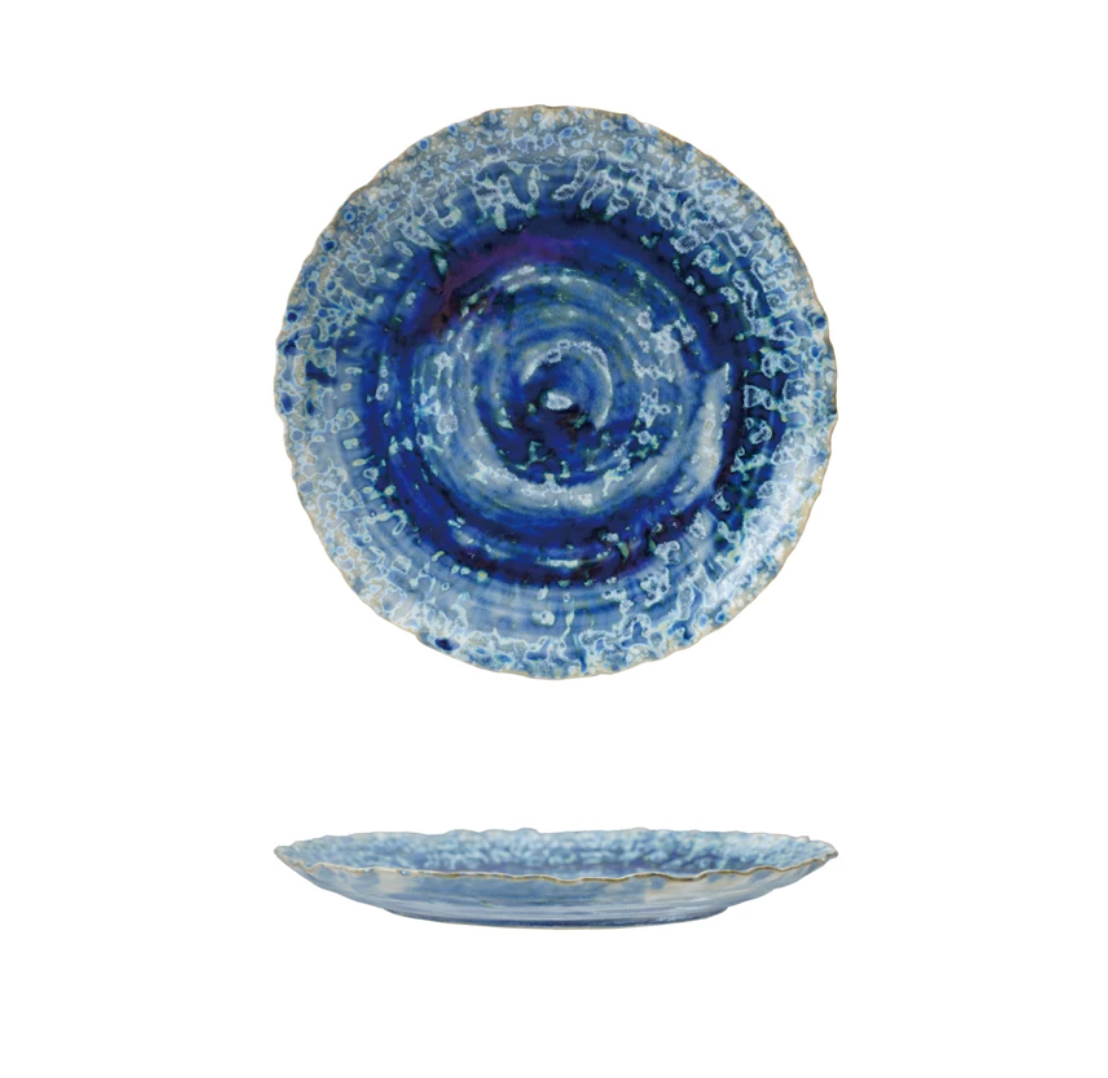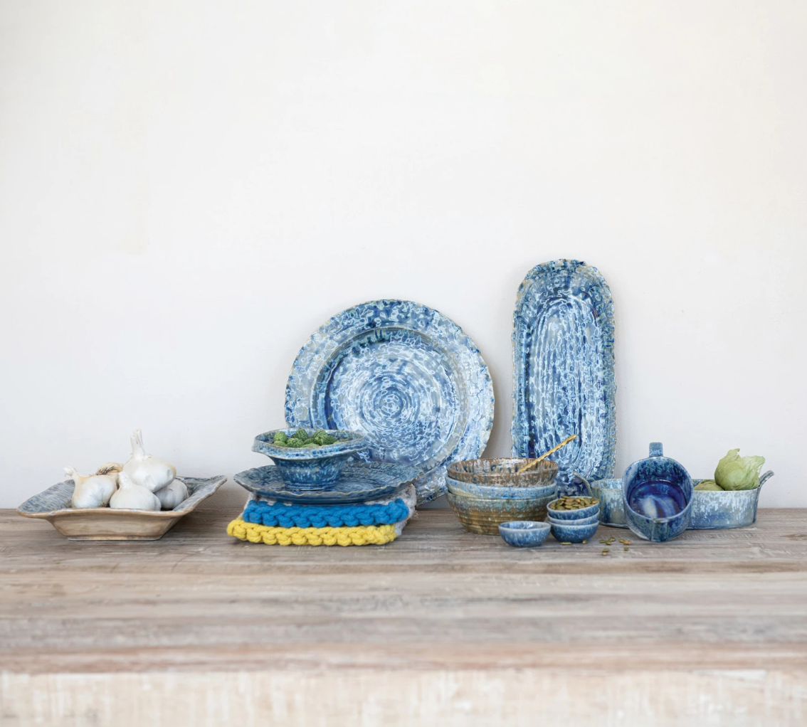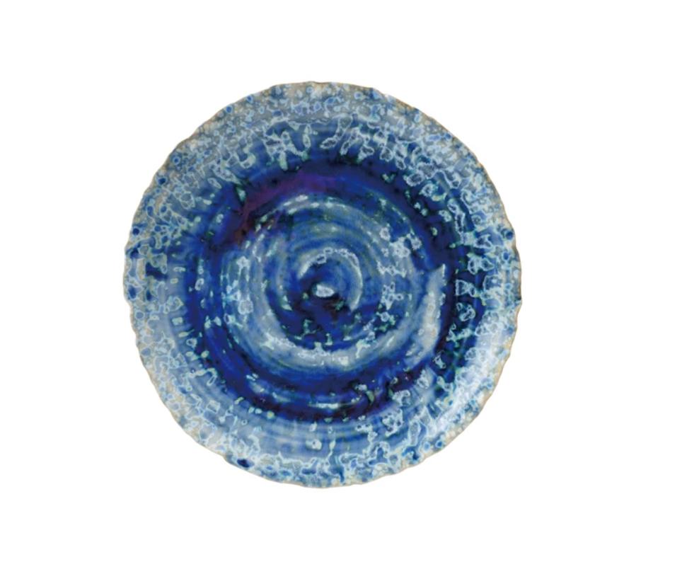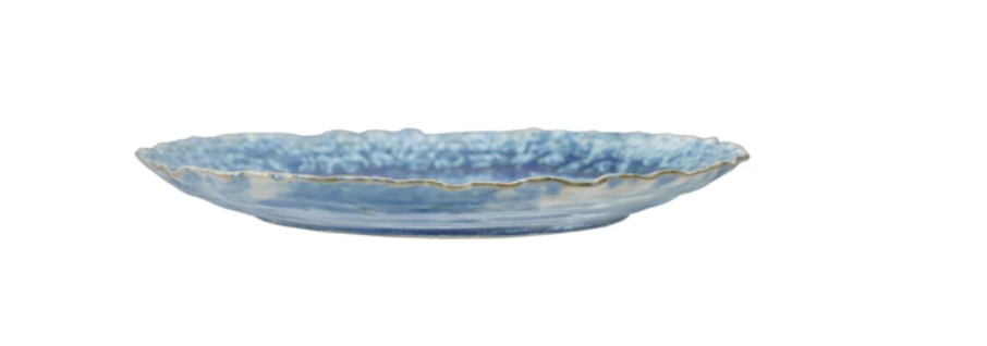 Elevate your table with our 9-1/2" Round Stoneware Organic Shaped Plate in a captivating blue reactive crackle glaze. Each handcrafted piece boasts a unique organic shape and a naturally varying finish, ensuring that no two plates are exactly alike.