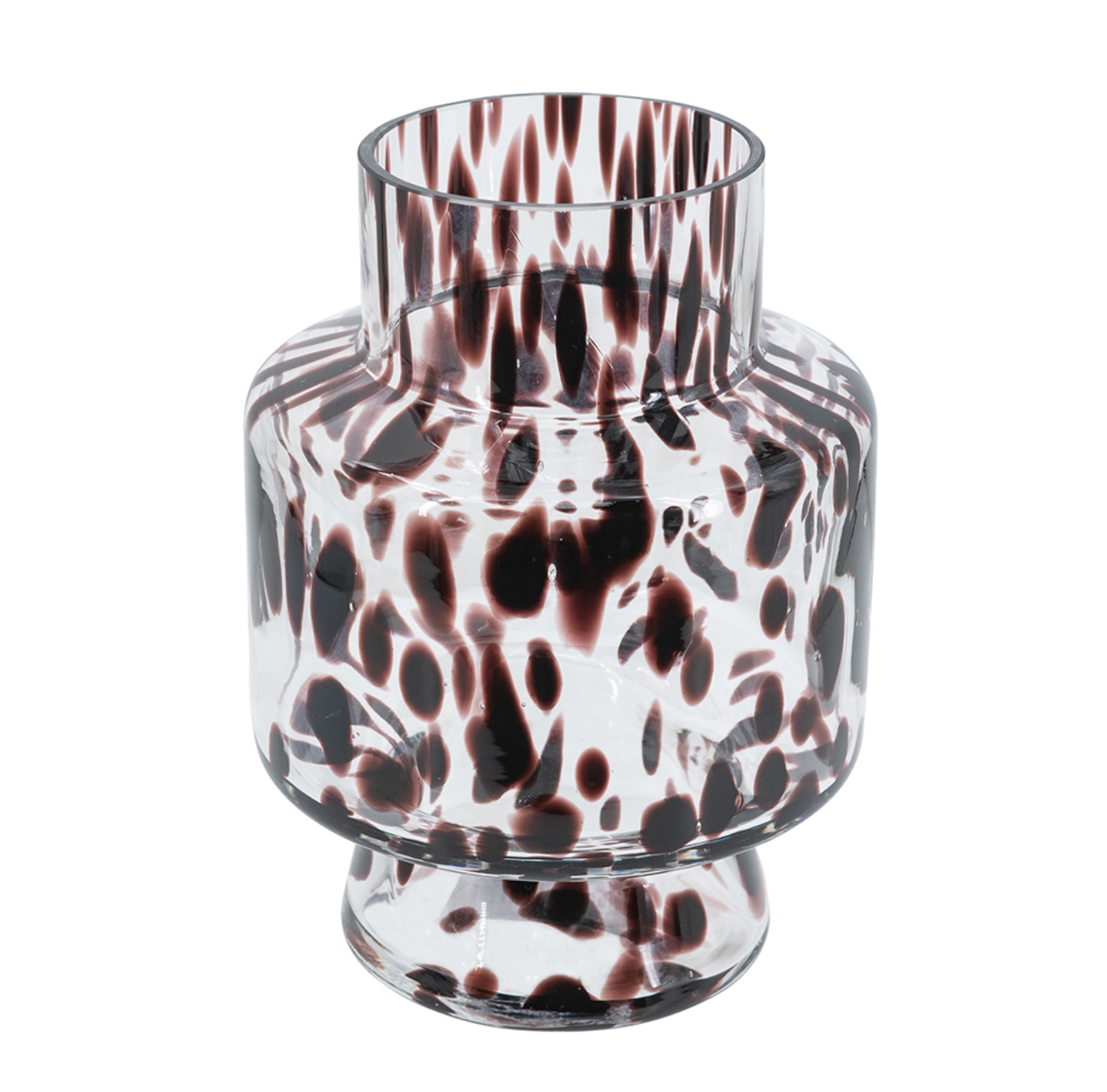 A true statement piece, this clear glass accent vase features hand-applied amber spots that create depth, movement, and a one-of-a-kind look. The sculptural silhouette adds a modern yet artistic feel, perfect for styling shelves, consoles, or coffee tables. Beautiful on its own or paired with fresh or faux florals, this vase brings an elevated, gallery-inspired touch to any space.