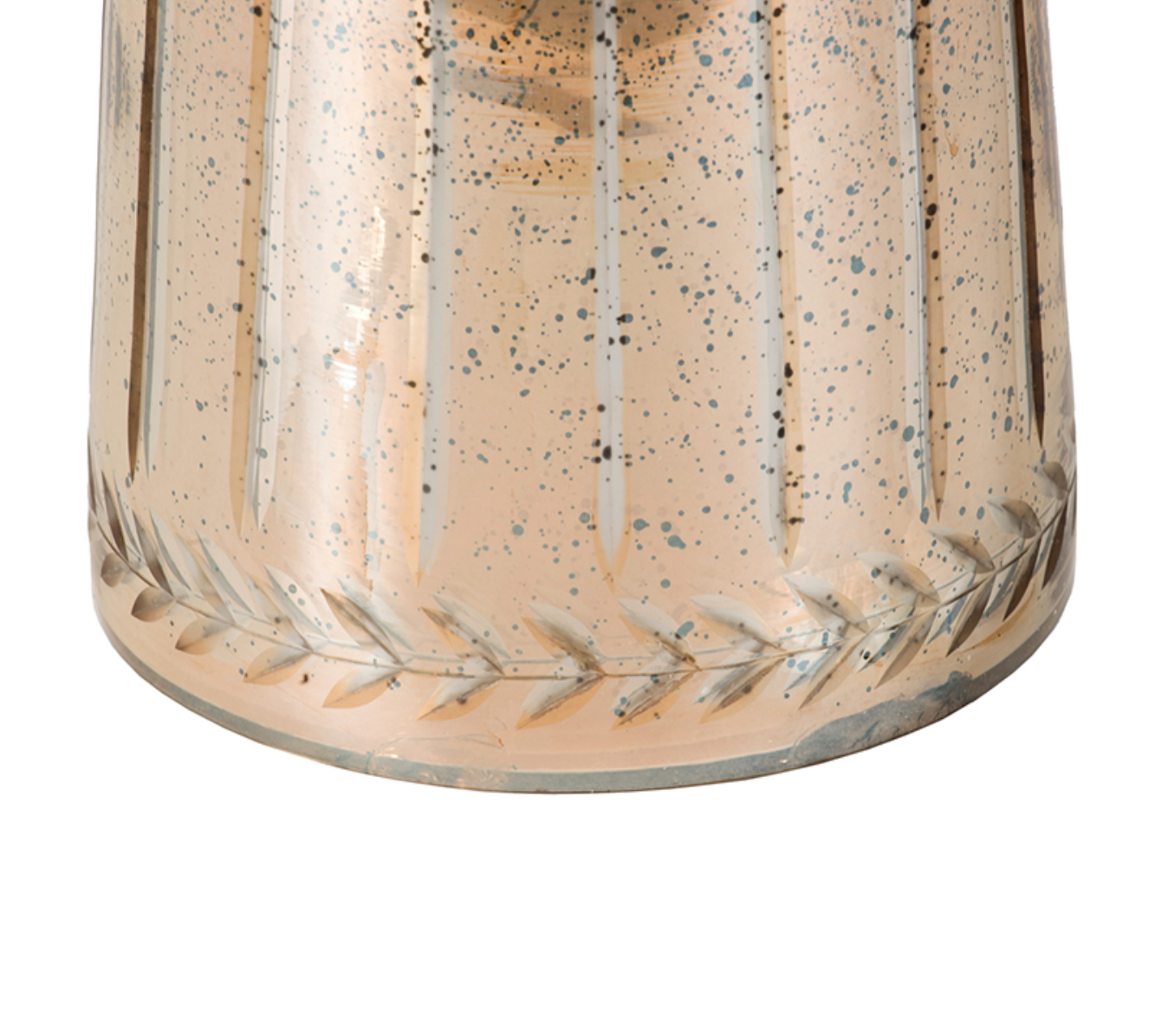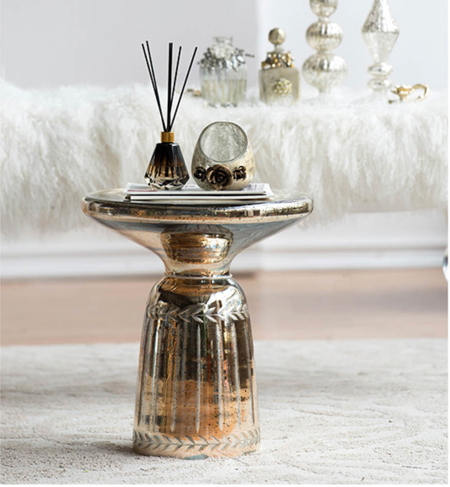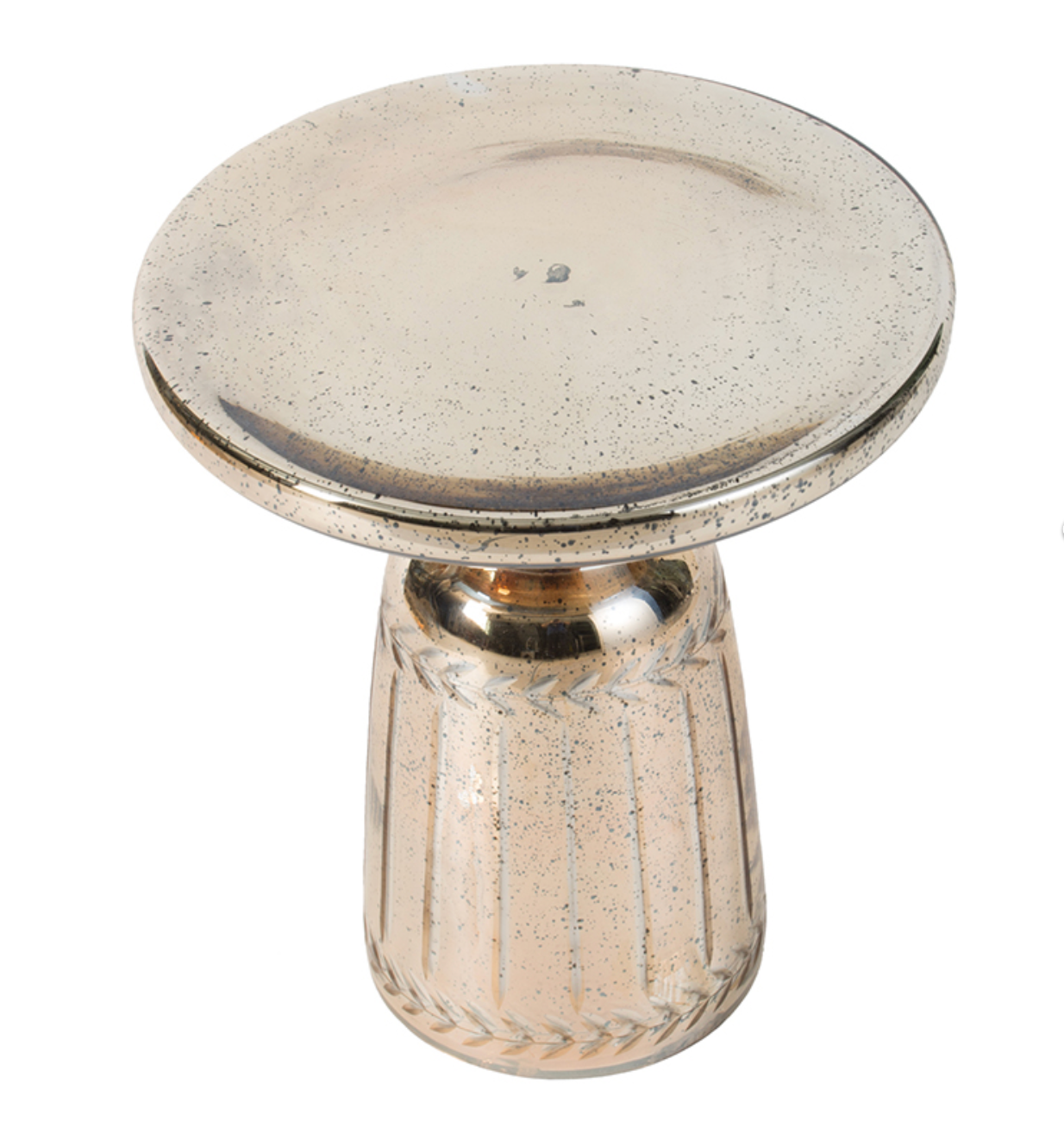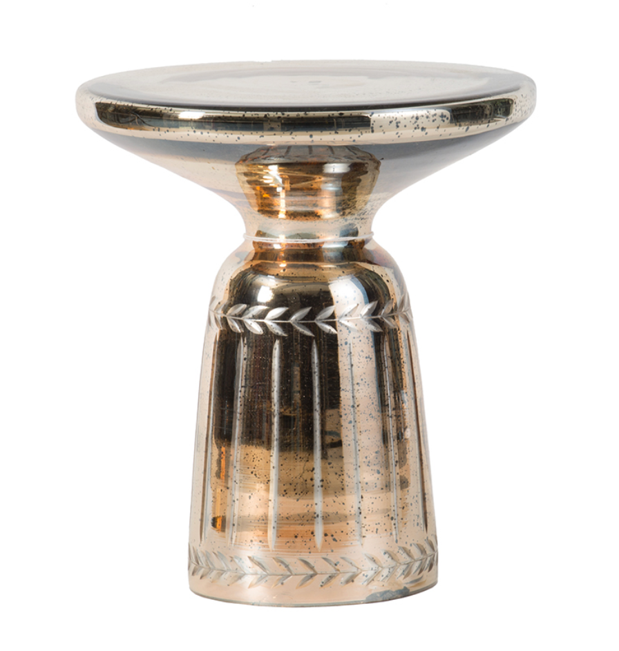 Glamorous and sculptural, this Gold Glass Side Table features a softly reflective, mercury-glass–style finish that adds warmth and sophistication to any space. Its pedestal silhouette is accented with subtle etched detailing, creating depth and visual interest from every angle. Perfect as an accent table beside a sofa or chair, this piece brings an elevated touch of elegance to both modern and transitional interiors.