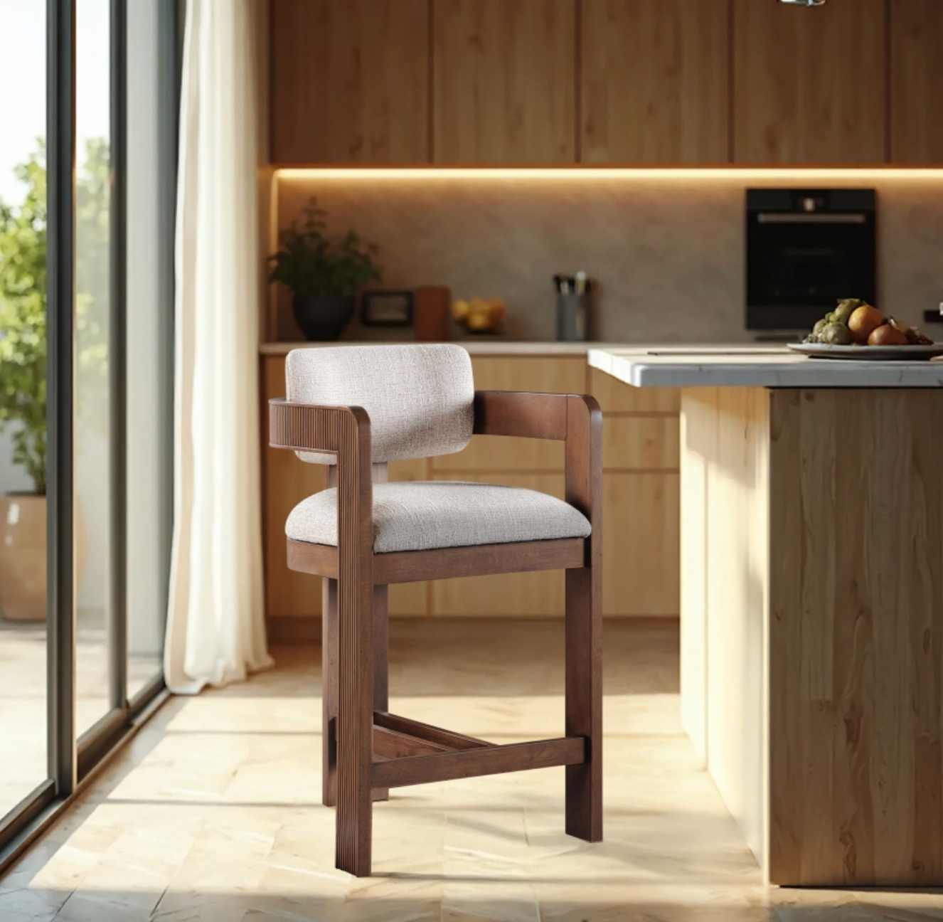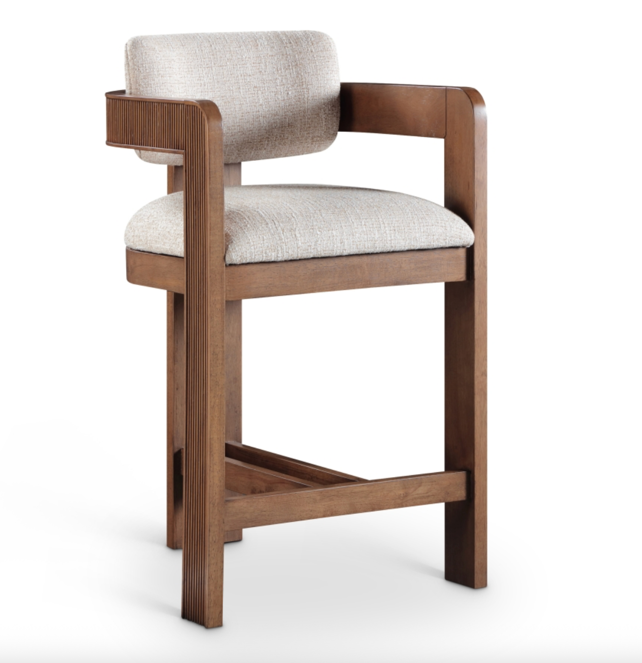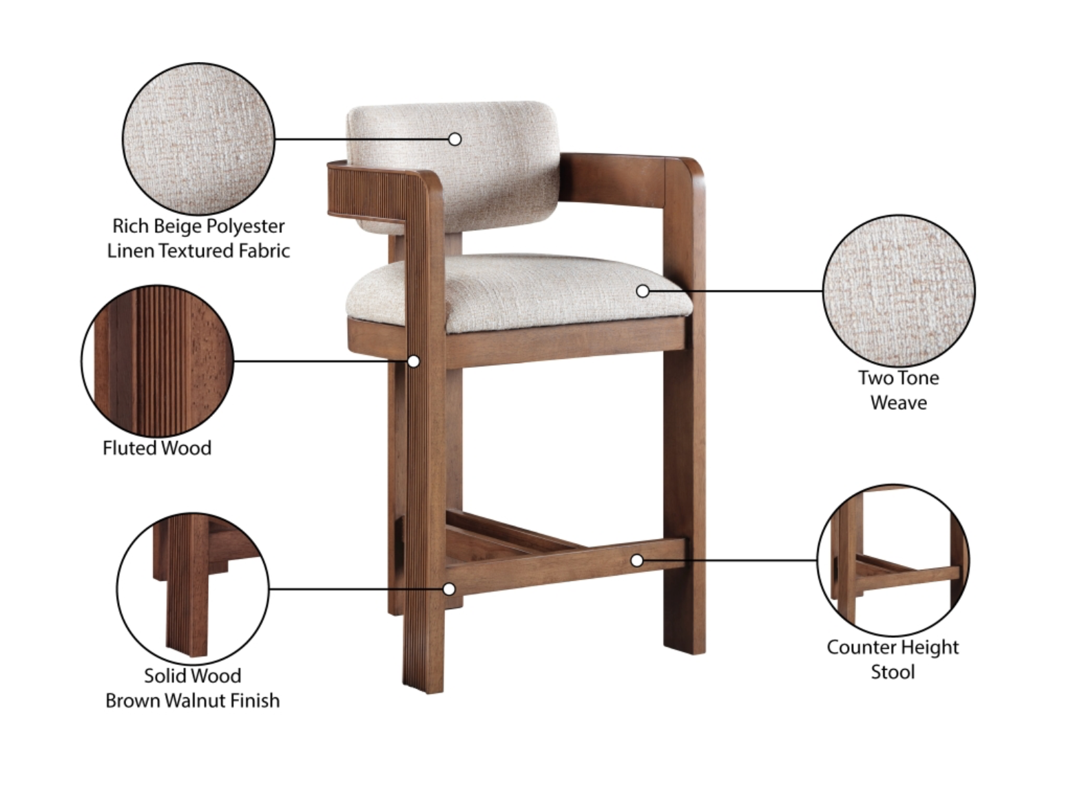 Elevate your counter seating with the Sacha beige linen textured fabric upholstered counter stool, a perfect blend of refined texture and timeless craftsmanship. Wrapped in rich polyester linen-textured fabric with a striking two-tone weave, this stool offers both depth and sophistication. The solid wood frame, finished in a brown walnut tone, showcases elegant fluted detailing, adding a touch of classic artistry.