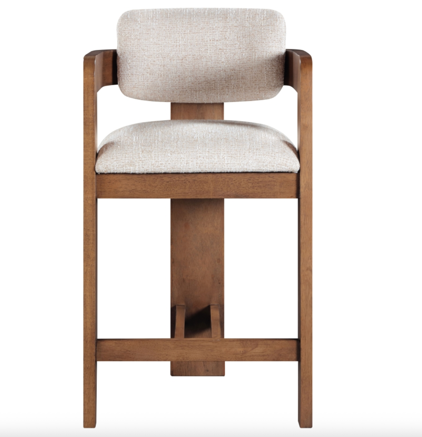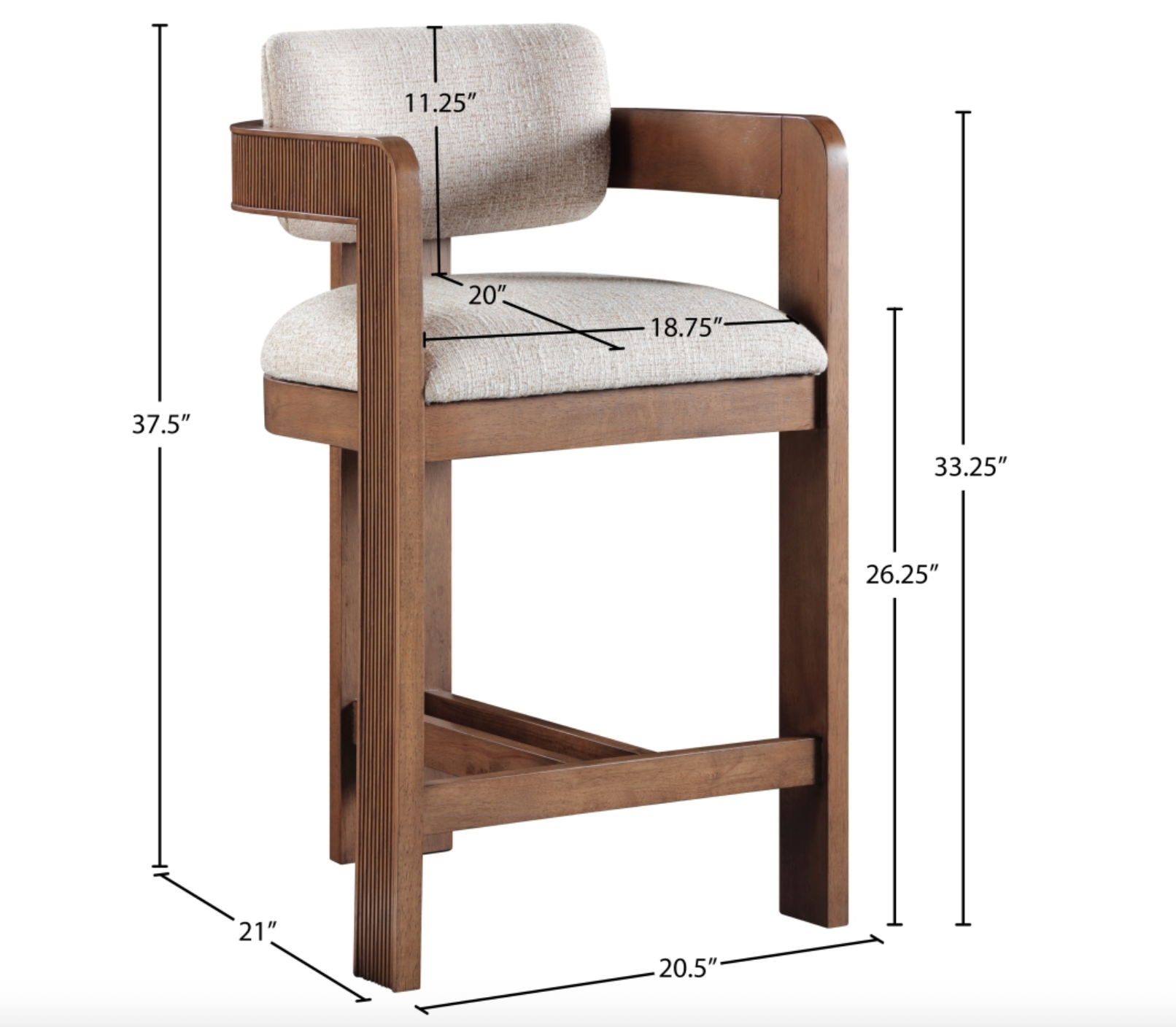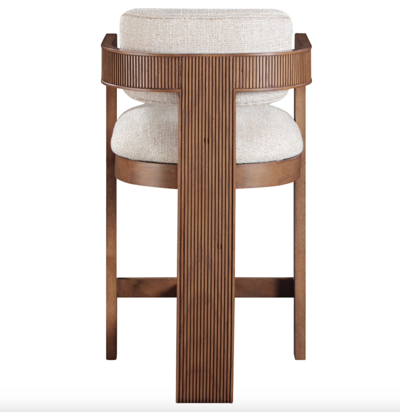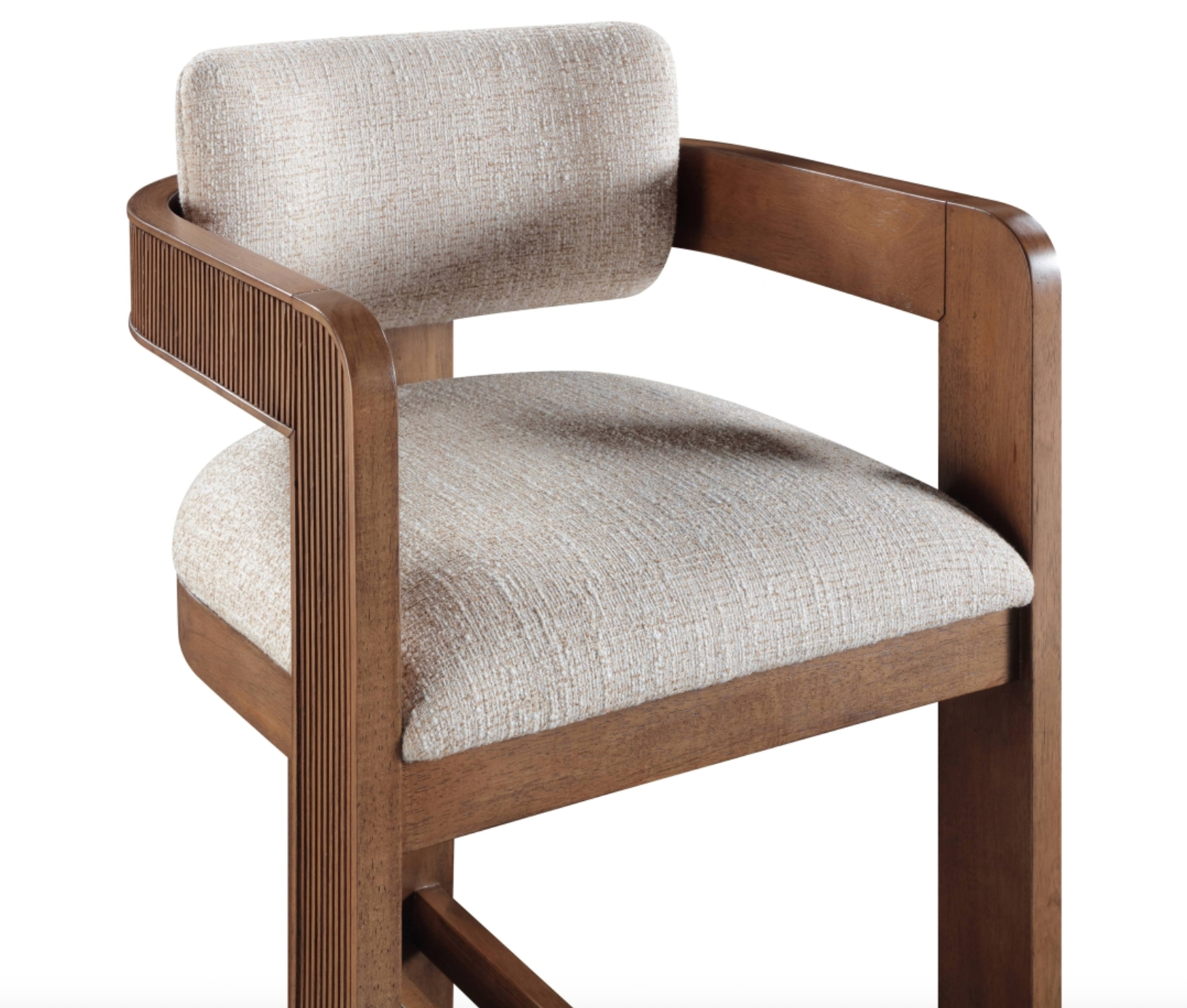 Elevate your counter seating with the Sacha beige linen textured fabric upholstered counter stool, a perfect blend of refined texture and timeless craftsmanship. Wrapped in rich polyester linen-textured fabric with a striking two-tone weave, this stool offers both depth and sophistication. The solid wood frame, finished in a brown walnut tone, showcases elegant fluted detailing, adding a touch of classic artistry.