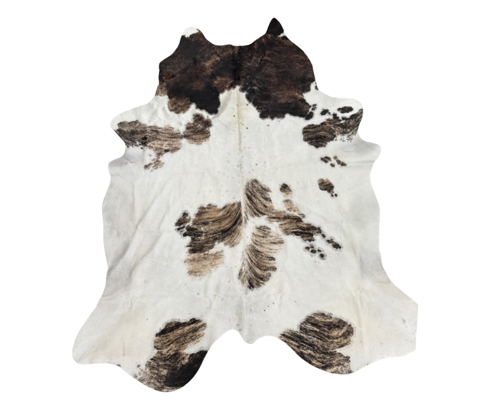 Our XL Tricolor Cowhide features a stunning blend of ivory, deep chocolate, and warm caramel tones — a naturally dramatic pattern that brings depth and character to any space. The rich dark patches along the top create a bold focal point, while the softer feathered markings throughout add movement and balance.