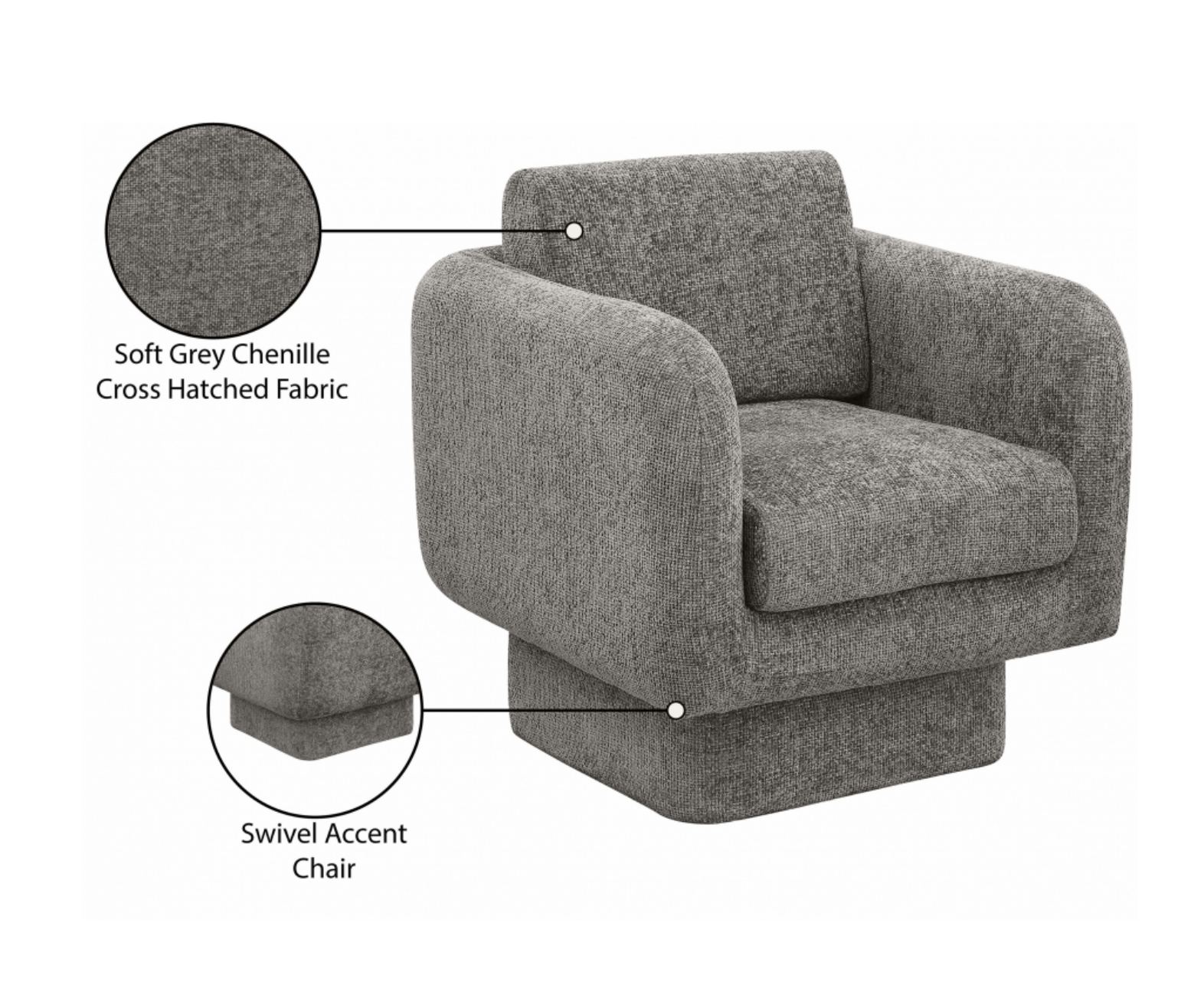 Seat guests in total comfort with this Alessandra chenille fabric swivel accent chair. Beautiful grey chenille cross-hatched fabric upholstery lets this fabulous chair blend seamlessly with existing furnishings. Overstuffed sides, back and seat cushions make this chair a comfortable delight to sit in while the swivel feature adds convenience to the design. Add it to an empty corner to create an inviting reading nook, or add it alongside a sofa or sectional for additional seating.